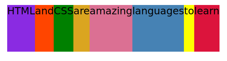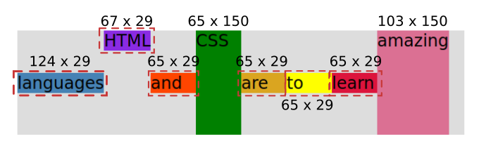 Instead of using the width property in flex, we use flex-basis. As shown in the following picture, if I set the flex-basis to 65 pixels, then flex automatically sizes each word to 65 pixels (with a height of 29 or 150 pixels), except for languages, HTML, and amazing which needed more than 65 pixels to begin with.
